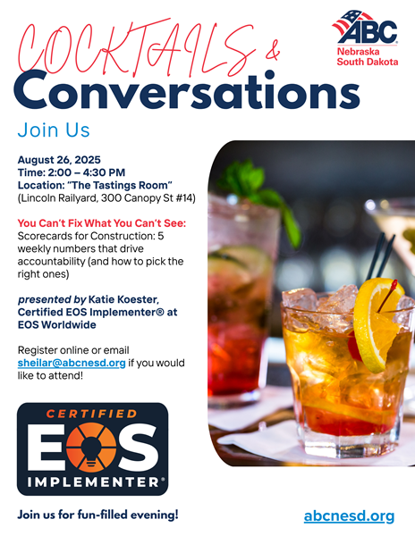 August 26, 2025Time: 2:00 – 4:30 PMLocation: “The Tastings Room”(Lincoln Railyard, 300 Canopy St #14)You Can’t Fix What You Can’t See: Scorecards for Construction: 5weekly numbers that drive accountability (and how to pick the right ones) presented by Katie Koester, Certified EOS Implementer® at EOS Worldwide